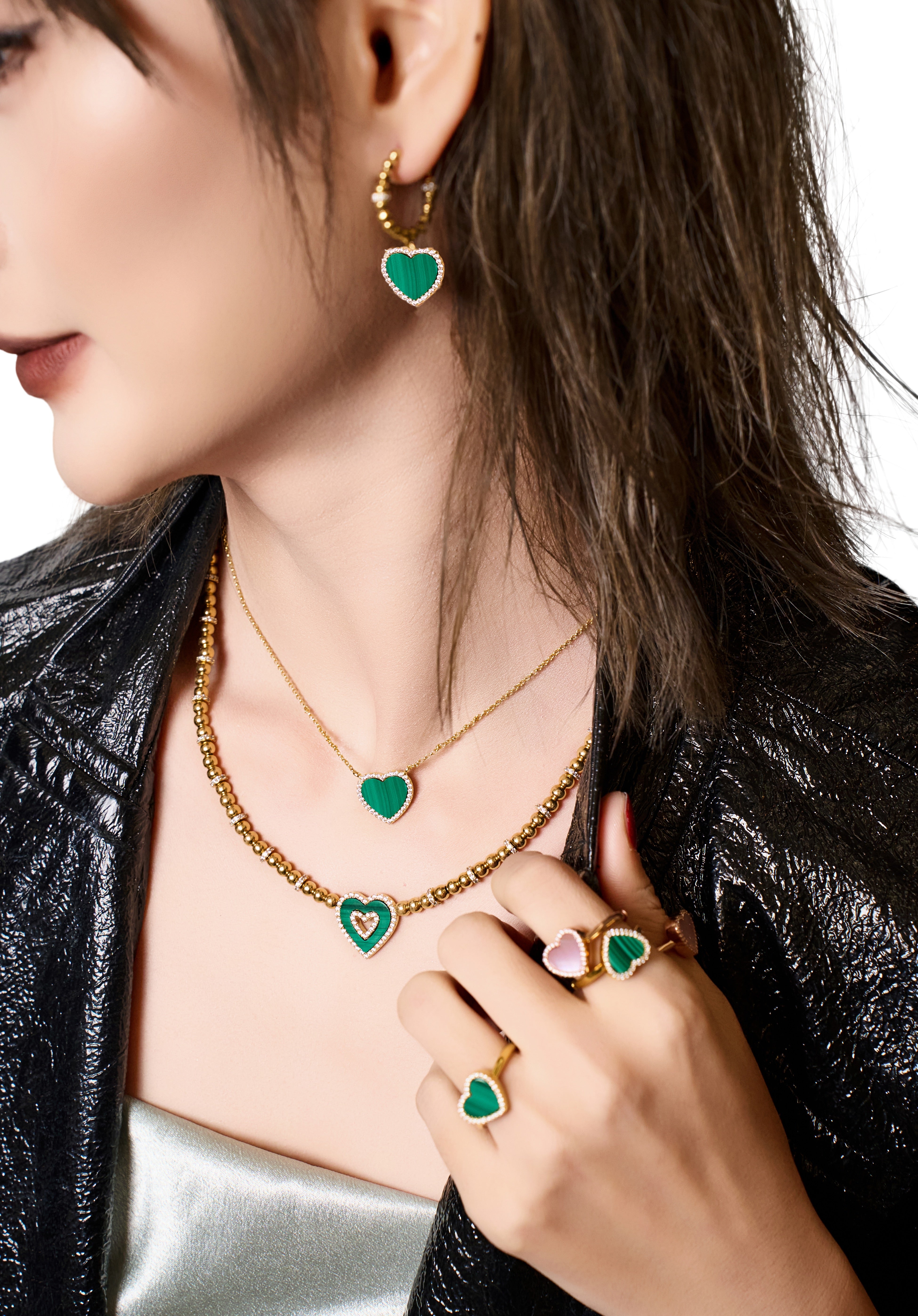 Love Heart Malachite Double Heart Necklace 18K Gold Plated