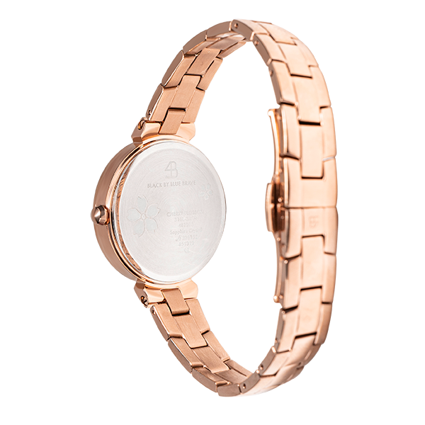 The Cherry Blossom Watch features signature two-piece hollow sakura petal hands. The minute hand is marked by a larger triangle, while the hour hand has a smaller triangle. As they move across the champagne mother-of-pearl dial, the blossoms seem to dance with time, adding beauty to every moment.