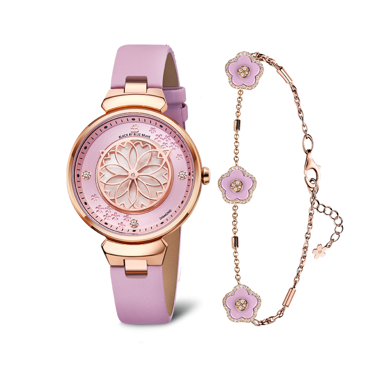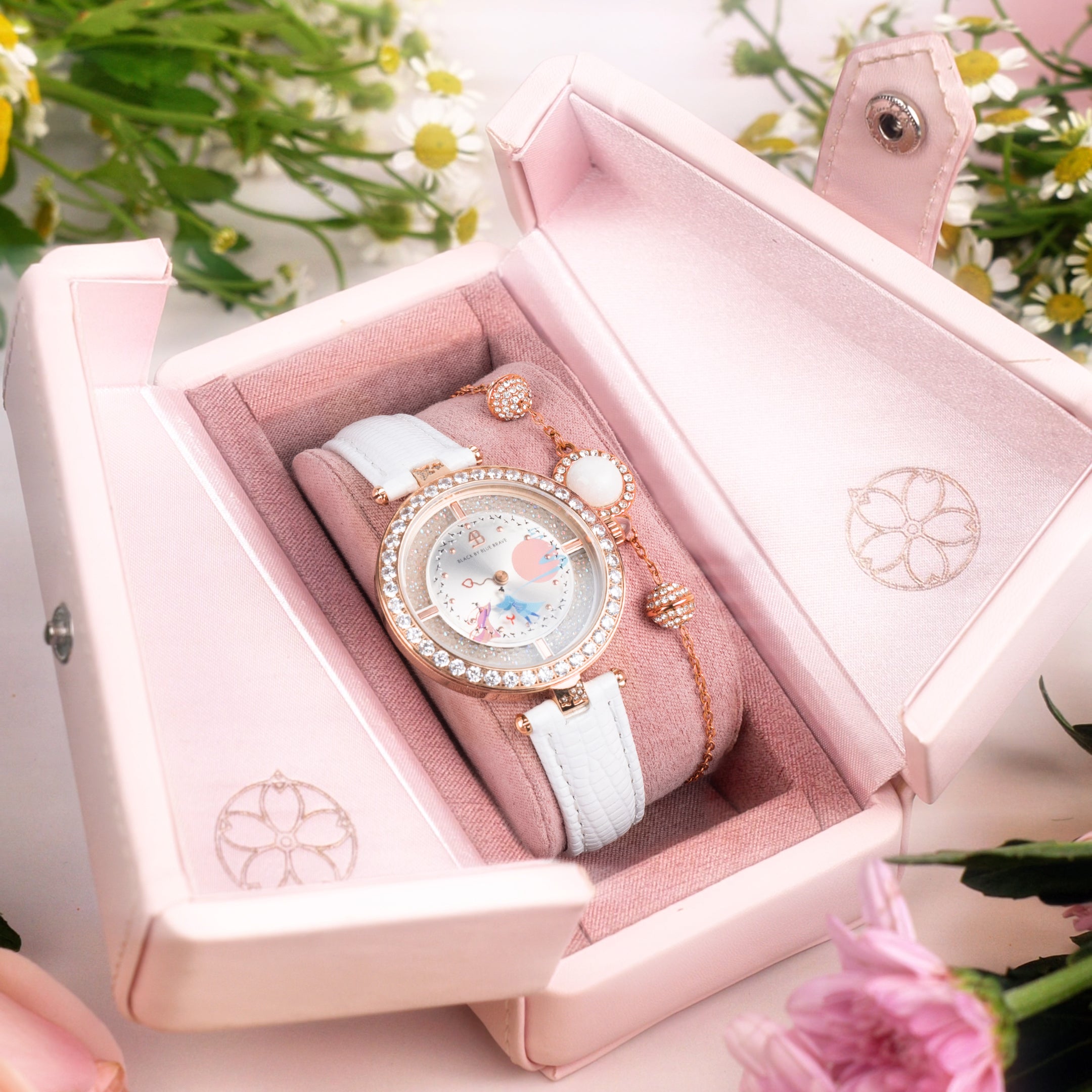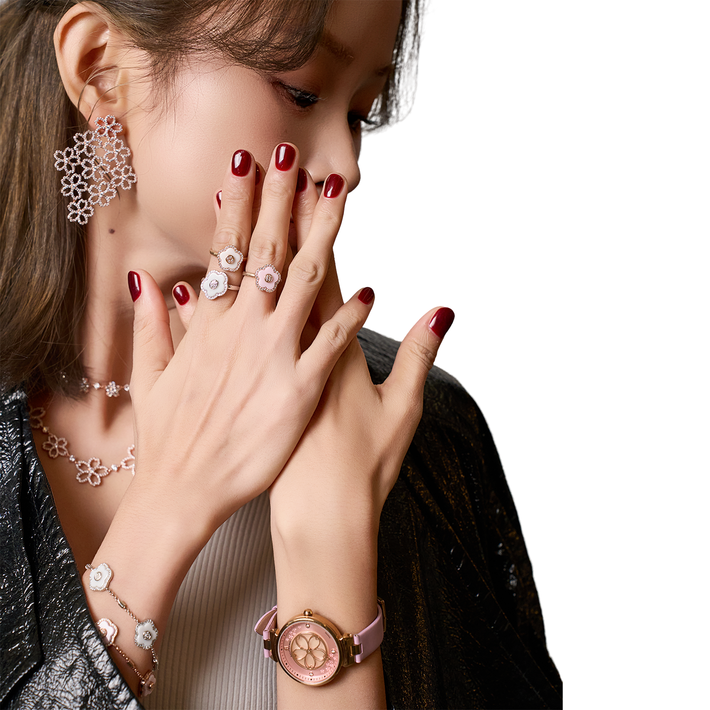 The Cherry Blossom Ceramic Jewellery collection features 18k rose gold-plated brass combined with elegant ceramic flower accents, creating a timeless and refined aesthetic.